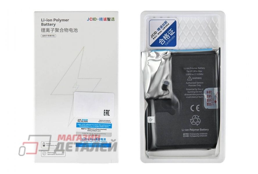 У нас вы можете купить аккумуляторную батарею (аккумулятор) JCID для iPhone 13 Pro Max 4550 mAh (повышенный емкости) по цене 1 965 р. с возможностью заказа услуги по установке и ремонту. Оплатить покупку аккумуляторной батареи (аккумулятор) JCID для iPhone 13 Pro Max 4550 mAh (повышенной емкости) можно наличными, электронными деньгами, банковской картой, по банковскому счету, наложенным платежом или по безналичному расчету. Доставить товар возможно с помощью услуг нашего курьера по Москве, с помощью курьерской компании или по почте России. Кроме того, к вашим услугам пункт самовывоза в Москве и России