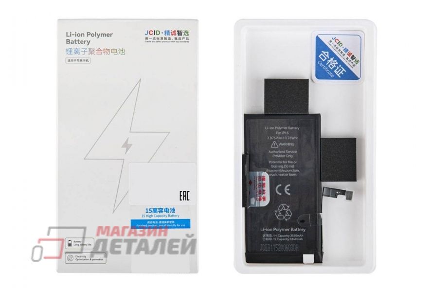 У нас вы можете купить аккумуляторную батарею (аккумулятор) JCID для iPhone 15 3550 mAh (повышенный емкости) по цене 1 620 р. с возможностью заказа услуги по установке и ремонту. Оплатить покупку аккумуляторной батареи (аккумулятор) JCID для iPhone 15 3550 mAh (повышенной емкости) можно наличными, электронными деньгами, банковской картой, по банковскому счету, наложенным платежом или по безналичному расчету. Доставить товар возможно с помощью услуг нашего курьера по Москве, с помощью курьерской компании или по почте России. Кроме того, к вашим услугам пункт самовывоза в Москве и России