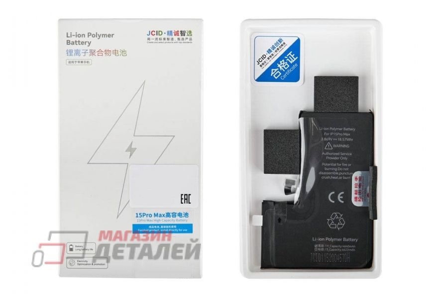 У нас вы можете купить аккумуляторную батарею (аккумулятор) JCID для iPhone 15 Pro Max 4800 mAh (повышенный емкости) по цене 2 290 р. с возможностью заказа услуги по установке и ремонту. Оплатить покупку аккумуляторной батареи (аккумулятор) JCID для iPhone 15 Pro Max 4800 mAh (повышенной емкости) можно наличными, электронными деньгами, банковской картой, по банковскому счету, наложенным платежом или по безналичному расчету. Доставить товар возможно с помощью услуг нашего курьера по Москве, с помощью курьерской компании или по почте России. Кроме того, к вашим услугам пункт самовывоза в Москве и России