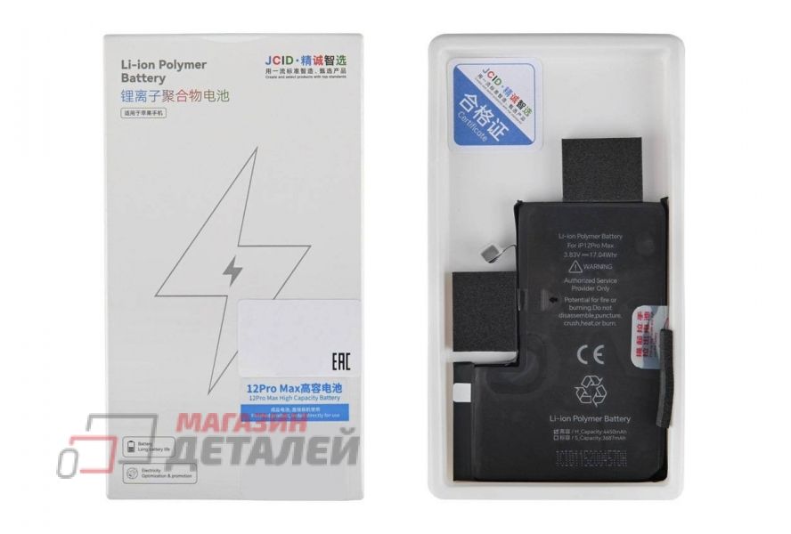 У нас вы можете купить аккумуляторную батарею (аккумулятор) JСID для iPhone 12 Pro Max 4450 mAh (повышенный емкости) по цене 1 735 р. с возможностью заказа услуги по установке и ремонту. Оплатить покупку аккумуляторной батареи (аккумулятор) JСID для iPhone 12 Pro Max 4450 mAh (повышенной емкости) можно наличными, электронными деньгами, банковской картой, по банковскому счету, наложенным платежом или по безналичному расчету. Доставить товар возможно с помощью услуг нашего курьера по Москве, с помощью курьерской компании или по почте России. Кроме того, к вашим услугам пункт самовывоза в Москве и России