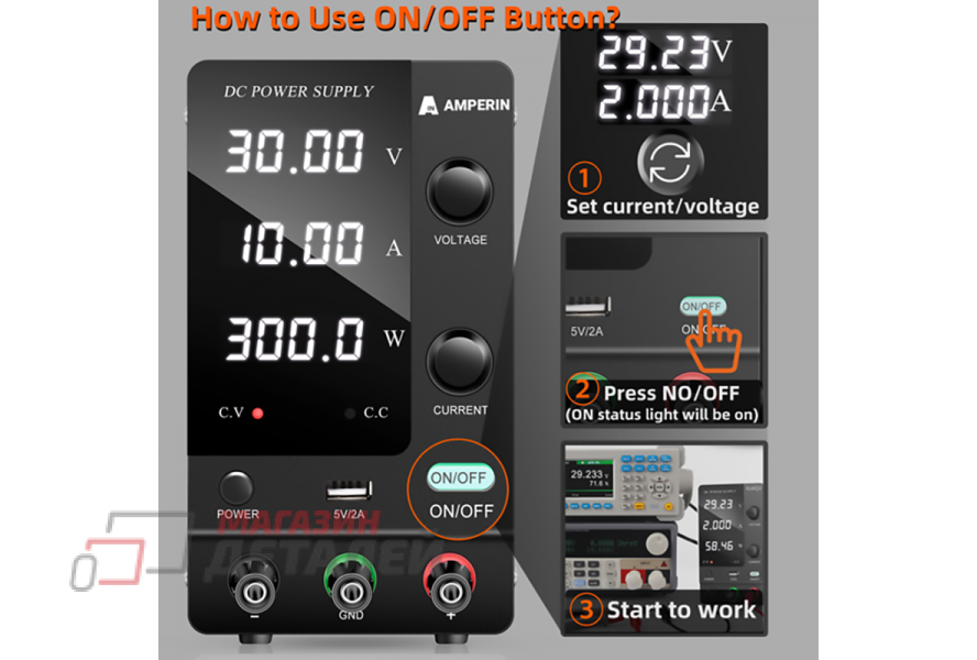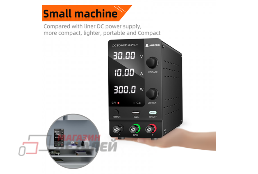 У нас вы можете купить лабораторную блок питания Amperin AI-C3010 30V, 10A по цене 5 580 р. с возможностью заказа услуги по установке и ремонту. Оплатить покупку лабораторной блока питания Amperin AI-C3010 30V, 10A можно наличными, электронными деньгами, банковской картой, по банковскому счету, наложенным платежом или по безналичному расчету. Доставить товар возможно с помощью услуг нашего курьера по Москве, с помощью курьерской компании или по почте России. Кроме того, к вашим услугам пункт самовывоза в Москве и России