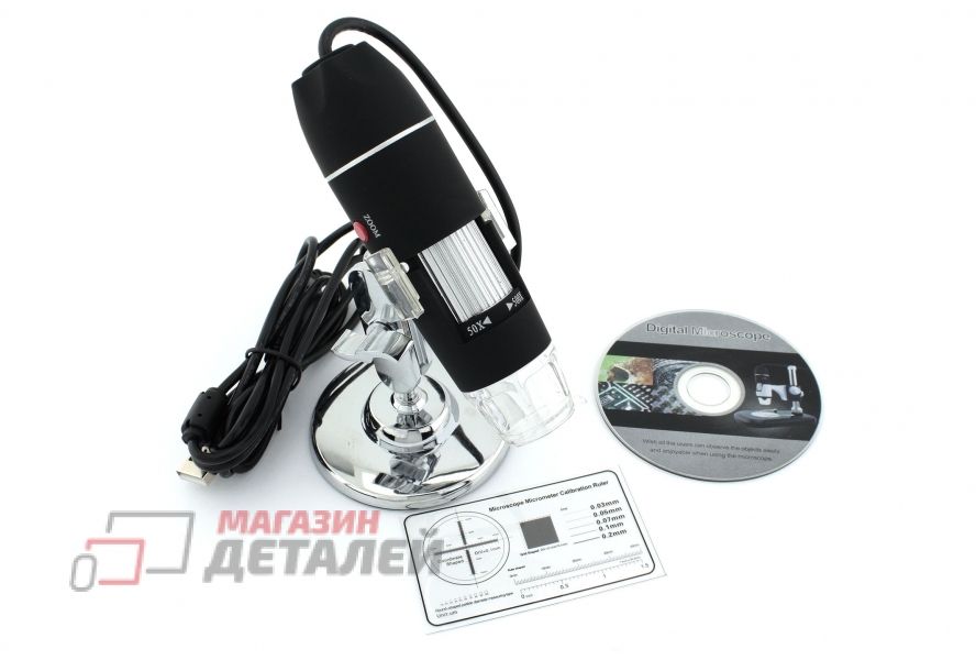 Комплектация Электронный USB-микроскоп Kaisi (500x), Гибкий штатив/держатель (гусиная шея), Компакт-диск с программным обеспечением и драйверами, Калибровочная шкала для точных измерений