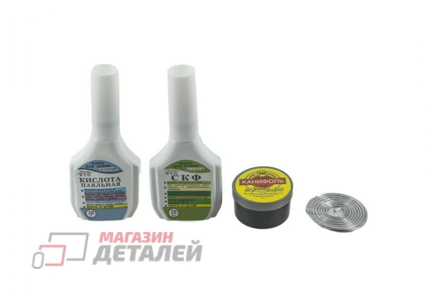 4 предмета в коробке: припой ПОС-61, кислота паяльная, флюс нейтральный СКФ, канифоль сосновая