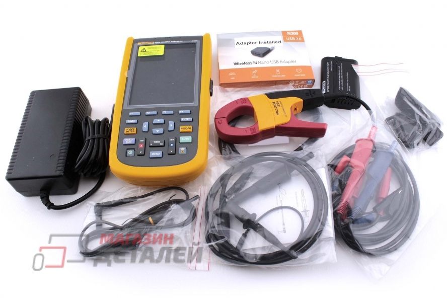Комплект: зарядное устройство / сетевой адаптер, переходник соединителя BNC однополюсного штекера и адаптер WiFi US, li-ion аккумулятор, 2 экранированных испытат. провода с заземлением, измерительный провод, 2 зажима.