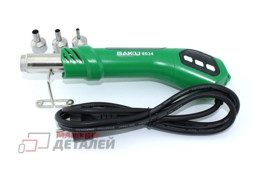 Паяльный фен Baku 8034 650W портативный. Технические характеристики: Потребляемая мощность: 650 Вт Диапазон настройки температуры: 100 °С - 500 °С Объем воздушного потока: - 120 л/мин (max) Уровень шума: < 50 дБУ нас вы можете купить паяльную фен