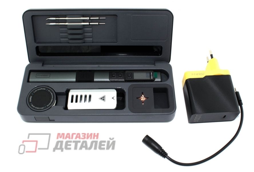 Комплект: футляр; паяльник Fnirsi HS02B; подставка; припой, проволока 42 г; очиститель; кабель-переходник; 3 наконечника, зарядное устройство 100W;